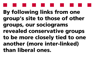 From parties and candidates, we turned our attention to organized interest groups and their presence on the World Wide Web. The Internet makes it easy for interest groups to communicate their messages and encourage political action. Looking at the home pages of these groups (e.g., the American Civil Liberties Union and the National Coalition for the Homeless) one can get a first-hand glimpse of how they educate, inform, and mobilize citizens. Moreover, by following links from one group's site to those of other groups, students can diagram the interconnections among conservative and liberal organizations. Not surprisingly, our sociograms revealed conservative groups to be more closely tied to one another (more inter-linked) than liberal ones. Students also examined the sites of marginal groups such as the American Patriot Network or the groups monitored by Hatewatch. Further, given the demographics of net users, students visited sites oriented toward the political and cultural concerns of women, African Americans, and Chicanos/Latinos.