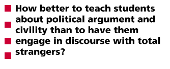 Still another example of interactivity came with student posts to message boards on the CNN Community Web site. Nothing gave my students more of a sense of engagement and empowerment than to see their message posted and have folks take their ideas seriously enough to respond to them in the forum. How better to teach students about political argument and civility than to have them engage in discourse with total strangers?