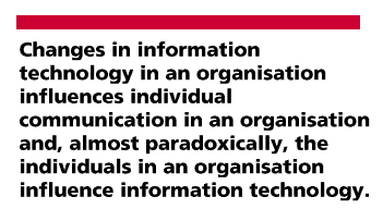 An organisation can be viewed as a human communication system in which networks of human nodes are linked internally, in a variety of ways, and with the external environment. To organise is to assemble ongoing interdependent actions into a sequence that generates an outcome (Weick, 1979). It is through communication that individuals and groups organise and hence, how organisations are created and maintained. (Zmud, Lind & Young, 1990). It has been suggested that the introduction of new technologies coupled with an increasing demand for faster and better forms of interaction alter communication activities and influence organisational communications (Culnan & Markus, 1987; Yates & Orlikowski, 1992). Changes in organisational communication in turn influence organisational structures and processes (Weick, 1979; Giddens, 1984).