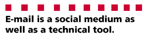 Alternatively these deviations may reflect the absence of secretarial mediation in this medium, weaker editing facilities or the lack of typing skills among users (Yates & Orlikowski, 1992). However, it is more likely that characteristics of the electronic medium interact with organisational norms in an adaptive process to achieve organisational and individual goals (Contractor & Eisenberg, 1990). Therefore e-mail is not a substitute for the memo but a complementary communication tool that facilitates new forms of organisational communication. For example, Markus & Robey (1988) in a study of e-mail usage found a convention she calls mosaic messages resulting from appending responses to received messages to create continuity and a conversational context. This suggests that when people use e-mail to communicate they do not simply send messages as electronically linked senders and receivers but (Ngwenyama & Lee, 1997) "perform social acts in action situations that are normatively regulated by, and already have meaning within, the organizational context." E-mail is a social medium as well as a technical tool.