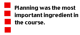 Planning: It is imperative to develop ways to make the distance-learning, Internet format work effectively. The experience gained from IOI has given us good insight into how to compensate for some of the shortcomings of using the Internet as a teaching medium. Nevertheless, planning was the most important ingredient in the success of the course. It required a proportionally great deal of preparation prior to the beginning of the semester.