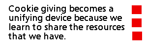 So, cookie giving becomes a unifying device because we learn to share the resources that we have. All of the examples above seem to demonstrate that cookie-giving is a quality that every one of us Internet users should develop and nurture. Finally, cookies may summarize succinctly a very American ethic which is so prevalent in the world of the Internet: a curious mixture of Christian values, individualism, endless/innumerable bounty, strict socialization and a touch of the child in all of us.