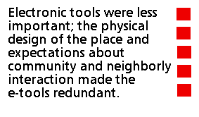 They interviewed hundreds of people, young and old, all of who were aware of the plans for the books. Most of the residents were married and had children. Frantz and Collins viewed the community from that perspective. Ross, who is single, rented an apartment in the center of town and became very knowledgeable about happenings in town and was an informal conduit of information. The place was fueled by rumors because there was no newspaper (until early in 1999) and only a Celebration Company newsletter. The online system was used during some crises, and the design of the town encouraged face-to-face contact with neighbors on the block, downtown, and at meetings of affinity groups. From their descriptions I believe that the electronic tools were less important to most people, at least for community deliberation and decision-making. The physical design of the place and the newcomer's expectations about community and neighborly interaction made the e-tools redundant. Possibly, the rest of us live in places that are not conducive to a rich interchange except under special circumstances (a town hall meeting, PTA, political rally) and that we are relying more on e-mail, chat, computer conferencing to fill that void.