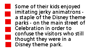 Web sites on Celebration have come and gone over the past two years. The Institute for Disney Studies is a ghost site with a few papers critical of Disney and a bunch of dead links. Kathleen Hogan's 1998 thesis on Celebration is a good online introduction, and it includes many photographs. However, she is no longer at University of Virginia. The most up-to-date site is on a Canadian system where the links are valid, and Celebration citizens are using a Web-based bulletin board to discuss various topics related to the town that they could not do on their own community intranet. The education system continues to be the main topic of discussion. I suppose the volatility of the Web should not surprise me. Though people like Brewster Kahle are trying to archive the Web, these books may be the longest lasting record of what happened in the early days of this (choose one) development/community/utopia. Aside from the town itself.