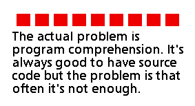 Anyone who has worked in a large re-engineering project forever remembers the feeling of frustration when first facing mountains of poorly documented (although not always poorly written) code. The availability of source code does not help much if key developers are no longer available. If the program or system is written in a relatively low level language like C, Cobol or Fortran and is poorly documented, then all major design decisions are lost in details of coding and need to be re-engineered. In such situations the value of higher level documentation, like specification of interfaces and descriptions of architecture, can be greater than the source code itself.