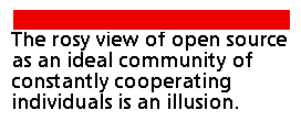 "Linux 8086 went on, the real developers have many of the other list members in their kill files so they can communicate via the list and there are simply too many half clued people milling around. It ceased to be a bazaar model and turns into a core team, which to a lot of people is a polite word for a clique. It is an inevitable defensive position in the circumstances."We will define political behaviors as those activities that are not required as part of one's role in a given open source project or movement, but that influence, or attempt to influence, behavior of other members within the group. Some of these acts are trivial like flaming, bypassing chain of commands, forming coalitions, obstructing unfavorable decision of the leader or developing contacts outside the group to strengthen one's position within the group. Other are borderline like in-fighting, sabotage, whistle blowing and public protests that affect status of the project or movement as a whole. Most politics in open source communities is trivial although some individuals try to play "hardball". It's quite pragmatic; borderline political behaviors pose a very real risk of group sanctions, including loss of both status and membership in the project or group.