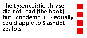 Slashdot also serves as a political instrument for suppressing opposition, but an investigation of this phenomena is beyond the scope of this paper. I would like just to briefly mention "Slashnoise". Slashnoise can be generally described as letters and other forms of commentary from readers expressing opinions about programs or papers that have never been read or used by the commentators. Such letters could be considered a special form of Lysenkoism, very close in spirit to "letters of workers and peasants" to the newspaper Pravdaduring the Lysenko years with the immortal and perfectly applicable phrase - "I did not read [the book], but I condemn it". Some researchers, such as Dr. Shaffer of Harvard (The Addiction Letter, (August 1995)), consider forums like Slashdot to be addictive. In that sense, Slashdot zealots are prisoners of their own "Slashdot cage":