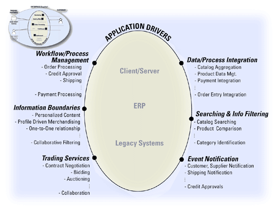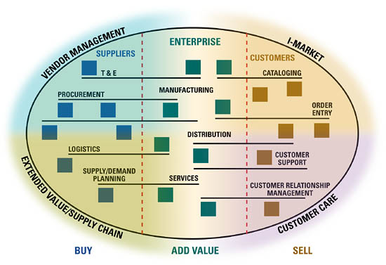 As shown in the center of the figure, this new business infrastructure applies to all kinds of businesses: manufacturing, distribution or services. In any industry, an enterprise is located in a value-chain where it buys goods and services from suppliers, adds value, and sells to customers. Value-chain analysis was pioneered two decades ago by Harvard's competitive strategy authority, Michael Porter. Rather that outdate Porter's work, e-Commerce provides the business platform for realizing Porter's visions. On the sell-side of an enterprise, customer-facing processes include catalog management, order entry, customer support and overall customer relationship management. On the buy-side of an enterprise, supplier-facing processes include procurement and supply chain management, travel and entertainment, logistics and collaborative supply and demand planning.