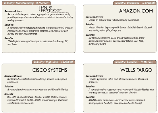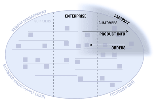Enterprise-class I-Markets harness the Internet to automate the business processes of selling a company's products and services. An I-Market can deliver a double impact, reducing costs while increasing revenues. A sustainable approach to implementing multiple I-Markets levers legacy enterprise systems and extends them to customers and the enterprise's trading partners. Howard Anderson, Founder of The Yankee Group and Battery Ventures confirms, "Every company has built order entry systems, customer support systems, and sales automation systems. What the smartest are doing is turning that embedded cost into "customer-facing" systems. By putting a user-friendly front end on top of a tried and true internal solution a company can build a strategic advantage. A company has achieved double leverage." Of course the tasks at hand are more than just putting a pretty face on top of existing enterprise management systems. Putting it all together for next generation I-Markets means extending core business processes with e-Commerce application drivers as shown in Figure 8.