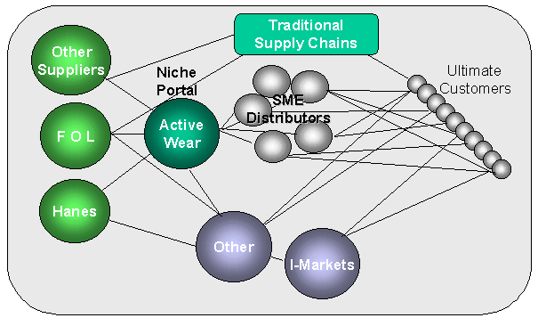 Figure 3 shows a scenario most companies will need to embrace as I-Markets emerge and mature. The figure shows how a company like Fruit of the Loom may likely evolve its many I-Markets. Fruit of the Loom's Activewear division is a leading manufacturer of T-shirts, fleecewear and knit sport shirts in the imprinted sportswear market. The Activewear division offers a wide selection of apparel products for garment decoration, screen printing, embroidery, appliques, heat transfers and more. When FOL pioneered its Activewear Web site it became a "niche portal" for this particular industry segment. By providing hosting services for its small and medium enterprise (SME) Activewear distributors, it wisely locked in its position as an industry portal, even at the expense of allowing its distributors to carry competing brands (e.g. Hanes) at the site.
