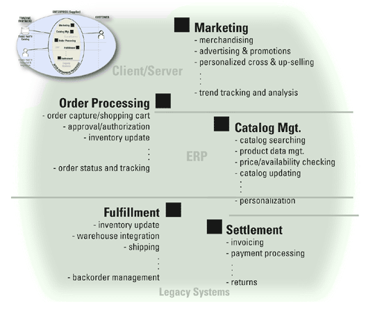 Integration to Back OfficeA simplified lifecycle (Marketing, Catalog Management, Order Processing, Fulfillment, and Settlement) is sufficient to describe the key inter-enterprise business processes common to all forms of I-Markets. These core business processes appear at the center of Figure 5.