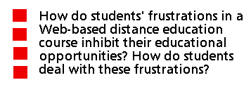 However, during the first several interviews, students frequently reported major frustrations with various aspects of taking an online course. We immediately investigated the research literature about online courses. A few studies mentioned students being frustrated with technical problems, but their authors emphasized the value of the students' learning. We felt that the substantial frustrations reported by our informants in B555 were not incidental and could actually impede their learning. Consequently we shifted the focus of the study to examine how much and in what ways students frustrations in an online course can inhibit their learning.