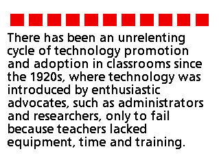 When computers were introduced in classrooms in the 1980s, "extolling the computers as a boon to critical thinking, professional educators by and large have been conspicuously uncritical about the computer itself" (Sloan, 1985, p.1). Rather than accepting the enthusiastic attitude toward technologies in education, Cuban (1986) observes an unrelenting cycle of technology promotion and adoption in classrooms by reviewing the literature on the educational use of motion pictures, radio and television since 1920s. The cycle indicates a pattern; technology was introduced in classrooms by enthusiastic advocates, such as administrators and researchers, but teachers failed to effectively use technology because of the lack of equipment, time and training. Cuban cautions us not to expect too much of computers in classrooms because their use may follow the same pattern as other technologies. As some authors (Dreyfus and Dreyfus, 1984; Ragsdale, 1988; Salomon, 1985; Sloan, 1985) criticize Computer-Assisted Instruction in K-12, recently other authors also have criticized educational computing in general, such as information technology in higher education (see Noble, 1998) and computers in schools (see Oppenheimer, 1997).
