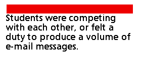 Third, students may not have had opportunities to express their frustrations with Web-based distance education. At the end of the semester, students might make positive comments about the courses because of a relief of finishing a course and concern about hurting instructors' feelings. For example, for the course we studied, a student posted a "thank you" note during the final week saying how much she had learned, and how much she appreciated these learning opportunities: