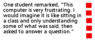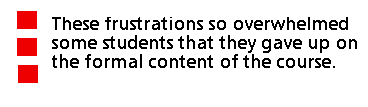In this section we describe some of the situations that students in B555 found to be particularly frustrating. The students did not report that all of their course activities were marked by frustration. However, these illustrate the kinds of events that stood out for the students.