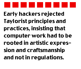 The emergence of hackers as an identifiable group coincides closely in time with the introduction of various Taylorist methods in software development. Many of the most skilled programmers resented what was happening to their trade. One of the things that characterized the early hackers, was their almost wholesale rejection of Taylorist principles and practices, and their continued insistence that computer work was an art and a craft and that quality and excellence in computer work had to be rooted in artistic expression and craftsmanship and not in regulations. So, long before the proponents of sociotechique and "Scandinavian School" system developers questioned the Taylorist roots of modern software development methods (Budde et al., 1992), hackers voted against it with their feet - by migrating to communities where a non-Taylorist stance vis-à-vis computer work was tolerated.