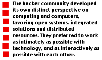 The reason the hackers preferred writing their own software and constructing their own machines was not just rooted in a frontiersman belief in self-reliance. By rejecting the fragmented and controlled world of corporate employment, the hacker community developed its own distinct perspective on computing and computers. This perspective favored open systems, integrated solutions and distributed resources. Whether this perspective emerged from the hacker's work style, or vice versa is impossible to tell, but the early hackers rapidly adopted a community-oriented style of working. They preferred to work as intimately as possible with technology, and as interactively as possible with each other. This meant that they wanted direct access to the computer, and they also wanted to share files, look at each others screen images, review and re-use each other's source code, co-author code libraries, and so on. The commercial machines and operating system of that era with their batch job submission systems, operator priesthoods and rings of protection were not suitable for this, and the hackers proceeded to construct tools that they felt they needed to support their style of working.