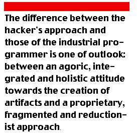 This does not mean that hackers are oblivious to such staple engineering practices as object oriented programming and information hiding. These and other sound engineering practices are routinely employed when hackers create complex software systems. But the difference between the hacker's approach and those of the industrial programmer is one of outlook: between an agoric, integrated and holistic attitude towards the creation of artifacts and a proprietary, fragmented and reductionist one.