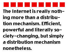 In terms of corporate use of the Internet - companies will be companies ... it's all about profit and the bottom line, and that won't change. I understand two to three billion U. S. dollars was spent online this past holiday season so I would imagine that vendors have now discovered the medium in earnest and I can see the stampede on the horizon. In the end, commercial concerns will use the Internet for WHATEVER SELLS. The question is will there be compelling 'public access sites' offering alternatively richer and more worthwhile information and discourse on the Net for those who want it?