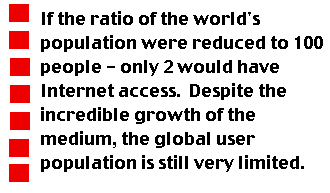 Daniel Erasmus astutely points out that if the ratio of the world's population were reduced to 100 people - only 2 would have Internet access. Despite the incredible growth of the medium, the global user population is still very limited - yet this statistic does not speak to 'collateral benefit' of the medium on the population at large. There is an oft-quoted statistic that 50% of the people in the world have still not made their first phone call. But just because everyone doesn't have a phone or make a call does not mean people don't benefit from the medium. Think of the village with one phone or radio or television in its community center. Not everyone needs to have a phone or the Internet to realize a benefit from it. The rural villager or farmer in the field may not need direct access to the Internet - but if you give access to the medical practitioner taking care of that villager and his neighbors or the agricultural representative helping the farmer with crop data you are making a significant difference. Now, is this the 'ideal'? No, it is not, but it is realistic and it does create impact - which is the real objective.