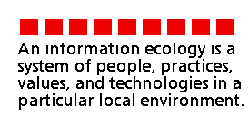 The word "ecology" is more evocative for us than "community," despite some similarities. Ecology suggests diversity in a way that community does not. Communities can be quite homogenous, or defined along a single dimension (the gay community, a community of scholars, a religious community). The parts of an information ecology are as different from one another as oak trees and scrub jays in a California woodland ecology.