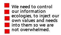 There is an urgency in the notion of ecology, because we all are aware of the possibility of ecological failure due to environmental destruction. While communities do indeed break down, and there is anxiety about this breakdown, ecological breakdown is disastrous and irreversible in a way that community breakdown is not. We feel a sense of urgency about the need to take control of our information ecologies, to inject our own values and needs into them so that we are not overwhelmed by some of our technological tools.