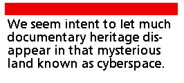 The information form of electronic media is changing our perceptions of the world and its people. And through electronic 'documents', future generations will experience a new sort of past. 'History' was once a discursive script written and acted by the rich, the powerful, and the educated. Because of their discursiveness, historical sources were also filled with arguments, propositions, ideas, and ideals. The growing archives of audio and video tape, however, thrust the common person into history; simultaneously, they reveal what is common even about our leaders. And the 'language' of these records is the experience-presentational-analogic form of gesture, feeling, and experience. It is not surprising that in the last three decades many discovered a new vacuum in our understanding of the past - the everyday experience of the common people who did not write down their thoughts and who did not make history, but who only occupied it. A whole new historical industry has developed that involves analyzing parish documents, gravestones, and other traces of 'the world we have lost.' [ 25]I am not quite so positive about this. And given that Meyrowitz wrote this over a decade ago, in a more innocent age (technologically speaking), others should be skeptical as well.For the past thirty plus years archivists and others have labored to create mechanisms for dealing with electronic records and other digital media. Much has been saved, more has been lost, and more seems doomed to be lost.