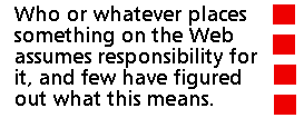 Using media like the Web does have other implications. For one, it, and other electronic information technology, does not necessarily help anyone or any group to write better. Theodore Roszak writes that the "computer contributes nothing essential to the life of the mind" and notes that "information [such as that found on the Web or in other electronic form] is worthless if it is not informed by ideas, values and judgment." Roszak believes the Web to be the "product of a predatory entrepreneurial sensibility" [ 21]. A predatory sensibility it is indeed, and one with no responsibility for long-term maintenance of what is placed on it. Who or whatever places something on the Web assumes responsibility for it, and few have figured out what this means. Printing out a Web site seems ridiculous when one tries to figure out how to deal with the multiple links to it, and these links are critical to the hypertext documents residing on the Web. But how does one effectively maintain an electronic version of such a site? If electronic mail has proved to be so difficult, prompting Alexander Stille to write his recent lament about information overload, maintaining Web sites pose a challenge of several additional orders of magnitude. In other words, I doubt that one would be visiting an electronic Declaration in the National Archives rotunda in the future. But maybe we shouldn't be worrying so much about the parchment version that sits there now.