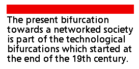 The present bifurcation towards a networked society is part of the technological bifurcations which started at the end of the 19th century and went through the whole 20th century. We have therefore already a period of about one century behind us. What effect had the technological revolution on the life of humanity in the past? In the 20th century, there were and still are tragic events: wars, ethnic purification, ... . But war and bloodshed are not something new. They existed always in our history. But there is also a constructive positive part of the technological revolution that is the decrease of inequality. At the beginning of this century, we had the gap between the "civilized" and the "non civilized". The non civilized could be treated only slightly better than animals. The inequality between social classes has also decreased as well as the inequality within the family. However we are still far from a satisfactory situation. The gap between industrial states and developing countries is increasing. We develop also a large gap between people who know and people who don't know. This issue acquires a new formulation in the Networked Society. As Alvin Toffler puts it: