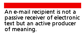 The concept of threading suggests that e-mail messages are part of wider communications web. E-mail is simply a message carrier, the e-mail recipient is not a passive receiver of electronic text but an active producer of meaning (Lee, 1994) who combines the received e-mail message with other, non e-mail, sources of information within the organisation.