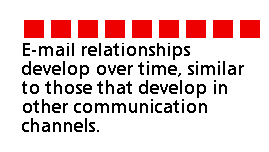 There were no messages that used emoticons, defined here as visual cues formed from ordinary typographical symbols that when read sideways represent feelings or emotions. (Walther & Burgoon, 1992). However, in the thread of one message a smiley figure was produced using key mapping. This generated a social response in the actual message discussed in this study, "He's giving me a hard time because I did a computer smile at him, which I've never done before." This example supports the social information processing approach of Walther (1992; Walther et al., 1994) that asserts e-mail relationships develop over time, similar to those that develop in other communication channels.