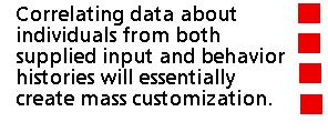 To enable customization for individual clients very large quantities of data will be required. Web sites will need to collect and store many small pieces of information, both the original messages that form the content of the site, and many details about individual clients who communicate with the site. The information about the individuals will be both that supplied purposefully by the individual and that recorded as the history of the individual interaction with the Web site. The data collected will replicate the information each person gains through personal contact between two individuals.