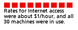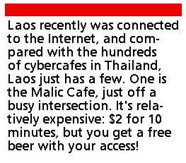 Laos recently was connected to the Internet, and compared with the hundreds of cybercafes in Thailand, Laos just has a few. One is the Malic Cafe, just off a busy intersection. It's relatively expensive: $2 for 10 minutes, but you get a free beer with your access! At a computer store near the hotel I met a young man who was helping the tourists access mail. His English was fair, but he worried more about his lack of knowledge about the Internet. When I asked how he learned, he said they taught themselves. They set up the server and LAN, leased a dedicated line from the PTT and began charging 1,000 yip (10 cents) a minute for online access. Offline composing of messages is a bit less. Most other providers in other countries have benefited from outside training courses, such as those sponsored by the Internet Society, or else they have learned from people who had already set up a TCP/IP service earlier. Setting up this business in such isolation is really very remarkable. It is like finding a Bible and trying to set up a local Catholic church by just reading the text. He asked me for help understanding electronic mail. He did not know about mailing lists, only about free Web-based e-mail. Nor did he know that many other services were being offered for free such as group calendars, large file storage, affinity group tools such as photo albums, discussion areas, and lists. He had not heard of Linux, nor did he know the sources online for more free information about the technical side of internetworking. I promised to send him pointers and information, once I had returned home.
