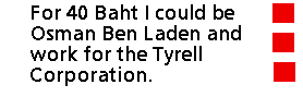 The U.S. Embassy and the Library of Congress held a reception for American attendees as well as the Thai organizing committee. Instead of holding it at the embassy, it is in the new Marriott in a ballroom where the food is distributed all around the room in a variety unmatched except by lavish Silicon Valley holiday parties. The hotel staff was so solicitous that if your drink fell below a certain level, someone wanted to give you a new one. The hors d'oeuvres included duck in cucumber, samosas with mint yogurt, spring rolls with jerked beef, prawns as large as I have seen, vegetables, cheeses, and a wide variety of desserts. One librarian was working on war crimes trials in Arusha, Tanzania, where the Rwandans are imprisoned. He'd prefer to be in Southeast Asia, and he plans to spend new years in Bangkok. A marketing expert tried to enlist me in her plan to build a library in Africa, but she has not involved any Africans in the plan, and she imagines I have some kind of unlimited resources to help out. It seems to be a classic case of a well meaning person not involving those who will be affected in shaping the whole project. Other IFLA regulars recount their trips to Burma (king cobra on the stupa that he is climbing), Angkor Wat (safe, hot, spectacular, and a five star hotel near the airstrip and the ruins) and some gorgeous beaches elsewhere in Thailand.The Khaosan Street is a backpackers ghetto that houses numerous guesthouses where backpackers can stay for $3/night and up. A few nice hotels are wedged in between the shops catering to young tourists, and there you can get a double with TV, phone, and air conditioning for about $10. This is kind of an interesting area where restaurants show pirated copies of movies all day long. Each posts a schedule at the entrance, near the menu. I asked a Thai if they ever use chopsticks, and he said, yes, when we eat Chinese food. So the Thais use a spoon and fork while Americans use chopsticks for Thai food. Out on the street there are tables set up to order fake identification cards: student, press, drivers licenses from Australia and California, and something called a United Nations ID card. Some of the vendors use dry transfer letters for the card and then laminate the finished work. One of the funniest examples is a UN ID card with Oliver North's picture. For 40 Baht I could be Osman Ben Laden and work for the Tyrell Corporation. The booths are usually quite busy. Outside of the U.S. Camel is positioning itself as clothing brand and fake Camel shorts and pants are on sale. The hiking shorts seem to be a bit lightweight, especially the "Timberland" long pants. However, the knockoffs of Alpine and North Face backpacks look sturdy and well sewn. The starting price for potential buyers is $60 for a full-sized one. TinTin shirts go for $3, and CDs with Office 2000, Encyclopedia Britannica, or Adobe PhotoShop are less than $10 asking price. The vendor has a booklet of color labels with no supply in sight. Presumably this is insurance against losing a supply of pirate copies in the event of a raid. A Microsoft official predicts hopefully that the rate of pirated software use will decrease radically due to stepped up enforcement.