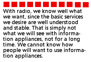 Don Norman would like computers to evolve the way radio receivers did. The problem is that with radio, we know well what we want, since the basic services we desire (such as music, talk shows, and news reports) are well understood and stable. That is simply not what we will see with information appliances, not for a long time. We cannot know how people will want to use information appliances. Note that even the Palm Pilot, beloved of millions of users, and frequently cited as the ideal outcome of the human-centered engineering advocated by Norman, is not stable. Not only is there a succession of new models from its manufacturer, but there are myriads of accessories offered by outside suppliers for wireless communication, control of other devices, and so on.