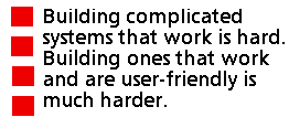 Building complicated systems that work is hard. Building ones that work and are user-friendly is much harder. Further, it is necessary to balance the demand for user-friendliness with the demand for more features. Although most users complain that they want simpler versions of applications such as Microsoft Office, their "responses support Microsoft's contention that while few people use more than a tiny percentage of the programs' features, everyone wants a different 10%" [ Wildstrom]. The history of the past two decades shows that when the choice was between new features and ease of use, new features have won. The victory of the PC over the Mac is just one example of this. As Edward Tenner [Tenner] pointed out,