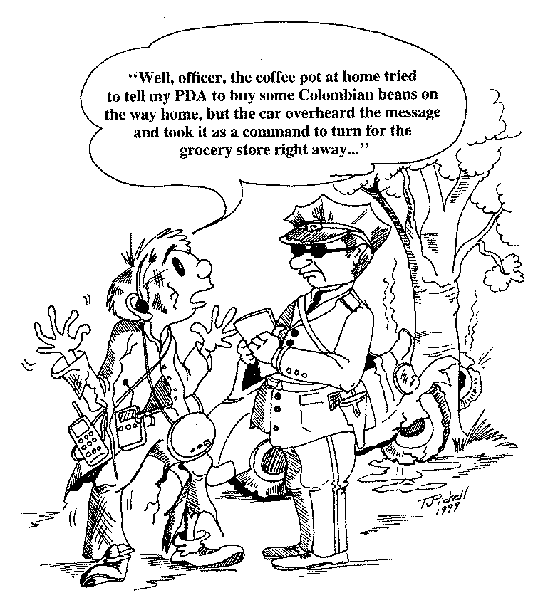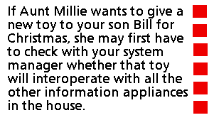 Careful design that is focused on human factors, and incorporates powerful processors and software, can provide information appliances that are a delight to use. The Palm Pilot and game consoles prove this. However, that does not mean that we will be delighted with the new electronic environment full of such gadgets, even if (and this is a big if) each is excellent by itself. Information appliances are not supposed to be standalone devices. In Don Norman's definition (p. 53 of [ Norman]), "[a] distinguished feature of information appliances is the ability to share information among themselves." Information appliances are meant to be "cooperating devices," a felicitous term coined by Bob Frankston. We will want our car to tell our house control system to warm up the family room in time for our arrival, and "the refrigerator [to] know it was low on milk and eggs and place an order with the local supermarket" [ Lewis]. Once all the radios, refrigerators, dishwashers, clocks, coffee pots, and other devices in our houses are replaced by new models that are information appliances, the current 40 isolated microprocessors per household may grow toperhaps 400 communicating devices. Will they all interoperate smoothly? They certainly do not do so now. Consider just the difficulty of setting up home networks, even for simple connections of PCs [ Lewis]. Similar problems arise in setting up cable modem and ADSL connections. Once the number of devices to be connected increases, and wireless communication expands, the difficulties will increase. No single problem will be insurmountable. However, the range of problems to be solved will be growing rapidly with increasing complexity of the system.