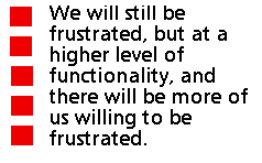 If the level of frustration is not going to decrease, is there any point in developing new technologies, and in paying any attention to ease of use? There certainly is. We will still be frustrated, but at a higher level of functionality, and there will be more of us willing to be frustrated. Just consider the Mosaic browser. It lowered the complexity of accessing the World Wide Web below some magic threshold and drew millions of people onto the Internet. These millions of new users then created new content, which drew in millions of additional users. That is how the Internet graduated from a research toy to a revolutionary tool that is transforming mainstream society. However, we now get frustrated by unreliable servers, network congestion, and stale URLs, problems that we did not worry about just a brief half-dozen years ago.