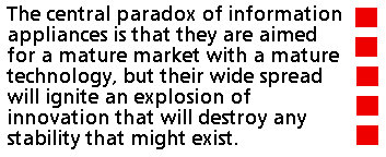 The central paradox of information appliances is that they are aimed for a mature market with a mature technology, but their wide spread will ignite an explosion of innovation that will destroy any stability that might exist. Don Norman argues in his book The Invisible Computer that the PC was aimed at the "early adopters" (in the terminology popularized by Geoffrey Moore [ Moore], see also [ Rogers]). The next step is to design information appliances for the mass market. He advocates a "user-centered, human-centered, humane technology of appliances where the technology of the computer disappears behind the scenes into task-specific devices that maintain all the power without the difficulties" (p. viii of the "Preface" in [Norman]).