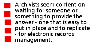 Even in entering a new century, many archivists - both experienced and novice - seem uncertain about how to contend with electronic records [ 1]. Of course, this may depend on how one frames this question. What archivists may be most sure about is that they do not have the solution to the management or maintenance of electronic records, although there are those who hold up the promise of a "magic bullet". These magic bullets offered thus far have raised as many questions as provided answers or solutions [ 2]. This is ironic at best, a disaster at worst. It is ironic in the sense that archivists and records managers have struggled or grappled with electronic records for over three decades. It is a disaster in the sense that new interests, like digital preservation and digital libraries, have focused on topics and issues that have not led to solutions for the long-term maintenance of electronic objects [ 3]. It is possible, of course, that some other societal or professional group, even a quite unlikely one, will emerge to salvage the documentary heritage that is in danger of being lost in the so-called Information Age [ 4]. But what will become of the archivists? What will become of archives? What will happen to the crucial archival mission? These are all real, honest questions, not merely alarmist cries to upset the profession.
