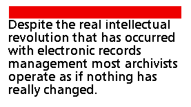 Some of this may be the reality of local versus national versus global realities. Denis Donoghue, commenting on the work of Michal de Certeau, understands that there are systems of power in place but that there is local resistance to this. "That is to say: local and individual practices do not fully yield to the system of power that for the most part controls them. Instead, they feature constant sleights of hand, bouts of opportunism, inventive trickery" [ 30]. We may be seeing this happen on the local level in the world of records professionals. Despite the real intellectual revolution that has occurred with electronic records management - the recognition that these records systems are the primary responsibility of archivists, that these are needed to be maintained in electronic form, that they challenge certain archival principles or assumptions - most archivists operate as if nothing has really changed. They are resisting something - of the change in their work, of a transformation of the kinds of long-desired researchers, or of a shift from more solitary and ordered practice to a more chaotic process of partnerships and collaboration.