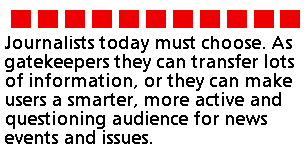 Why has the old mindset persisted? Two journalism professors write: "Newspaper companies are businesses first, and they are culturally and corporately unable to understand the egalitarian, decentralized, peer-to-peer, autonomous nature of communication on the Net" (Martin and Hansen, 1998: 46). Others mention newsrooms that breed aloofness, a reluctance to update antiquated computer systems and a lack of understanding about the nature of the Net, especially interactivity (see Wickham, 1997). Some reporters resist the idea of answering e-mail from readers, complaining they'd be busy working on their next assignments and wouldn't have time answering questions about old stories (Riley et al., 1997; Wolff, 1994). Such reporters just don't understand new media. According to McAdams, who helped create the Washington Post's online service, "A journalist with little online experience tends to think in terms of stories, news value, public service and things that are good to read, but a person with a lot of online experience thinks more about connection, organization, movement within and among sets of information and communication among different people" (1995: 84). Journalists today must choose. As gatekeepers they can transfer lots of information, or they can make users a smarter, more active and questioning audience for news events and issues (Singer, 1994). Making users smarter means involving them in a collaborative experience; i.e. interaction (Schlossberg, 1998: 71).