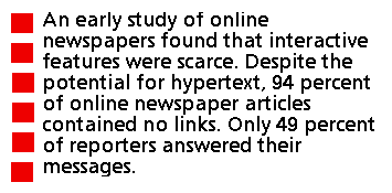 An early study of online newspapers, however, found that interactive features were scarce (Tankard and Ban, 1998). Despite the potential for hypertext, 94 percent of online newspaper articles contained no links. Only 49 percent of reporters answered their messages. Search engines were present at 64 percent of online newspapers, and readers seldom could add information to an online paper's Web site.