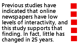 Previous research studies and the professional literature have indicated that online newspapers have low levels of interactivity, and this study supports that finding. In fact, little has changed in 25 years. Videotex wanted to electronically push news into people's homes, and so do today's online papers. Both promised more timely, thorough and personal news. Both largely ignored the basic properties that distinguished new media. Both have failed to earn profits. "Interactivity" has remained a buzzword that many people use, yet few define the concept.