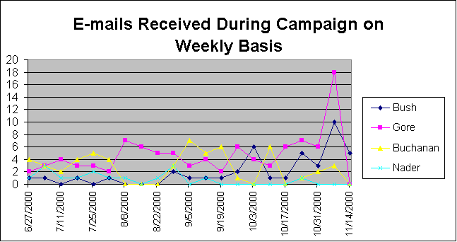 Starting 1 June, and continuing until Thanksgiving Day, 23 November 2000 - 16 days after election night on 7 November 2000 - we monitored the Web sites of the major candidates for President of the United States: Pat Buchanan ( www.buchananreform.com), the Reform Party candidate; George W. Bush ( www.georgewbush.com), the Republican candidate; Al Gore ( www.algore2000.com), the Democratic nominee; and Ralph Nader ( www.votenader.com), the Green Party candidate. We used a small shareware tool that employs a spider technology to capture the candidates' Web sites [ 3]. Sites were captured and stored once a week, providing HTML material to discern a sense of the pages' development for design, content, and interactivity over the course of the campaign (This amounted to more than 40 billion bytes of data.). In addition, we subscribed to the candidates' e-mail lists in order to track the amount and kinds of mail - electronic or otherwise - we might receive from the candidates [ 4]. We were particularly interested in anything beyond the "shovelware," (Weise, 2000) either print or electronic, that is, material originating for another, generally older medium, and used to fill a Web site. Shovelware generally includes speeches, position papers, news releases, videos, canned interviews, TV and radio spots, etc. Were these sites providing content or services that were indigenously Web-based? What was the technology that was embedded in the pages, and what was its effectiveness? To gauge the timeliness of the sites, to compare the sites to the context of the news cycle, we used the New York Times, the national paper of record, as a benchmark.