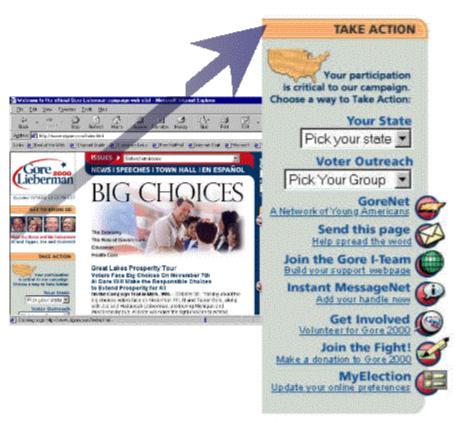 With that in mind, then, who did what well? Some of the sites evolved from being an information desk - albeit one at which the attendant asked the visitor for a contribution before he or she left - to a warrior barracks, where one could be given the tools to become a one-person campaign shop with the options of hooking up with other warriors to form a tribe. After fundraising, this may be the most important development for this election cycle and potentially the most important tactical tool of election 2000.