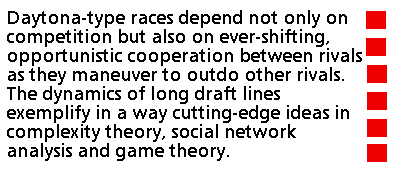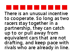 There is something alluringly American about this crafty kind of teamwork, and it transcends whether we are in an industrial or an information age. The dynamics of long draft lines even speak to cutting-edge ideas in the social sciences about complexity theory, social network analysis, and game theory. This "dumb" motor sport provides a laboratory for seeing how out-competing can depend on out-cooperating.