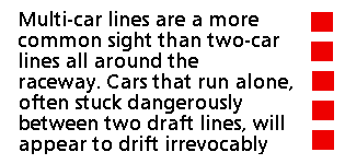 Once the racers sort themselves out — after ten to twenty laps — it is common to see a single draft line of four to seven cars running in front, pursued a hundred or so yards back by a second line of cars, all another hundred or so yards ahead of a large pack of cars that may still be running in parallel lines but are doing more dicing than drafting with each other. But sometimes two parallel lines endure up front for many laps. Whatever the configuration, multi-car lines are a more common sight than two-car lines all around the raceway. Cars that run alone, often stuck dangerously between two draft lines, will appear to drift irrevocably backward.