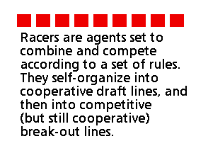 This constant gauging of other drivers' intentions, this constant interplay between getting helped and getting hung, and their effects on the dynamics of long draft lines provide good material for doing a social network analysis. It also takes us to the next mode of understanding, which is geared to understanding the driver's-eye calculus.