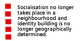 The less athletic stay at home and explore the Internet to communicate with almost everyone in other parts of the globe. In this way they possess the illusion of meeting other cultures. Research has shown that this creates planetary subcultures between people who only have their invisibility in common. That explains why Flemish MTV watchers may feel closer to New York rappers than to their own neighbours, without ever having been to New York. The British sociologist Giddens calls this the differentiation of space and time: there no longer is a necessary correlation between the creation of one's identity and one's physical environment. In other words, socialisation no longer takes place in one's neighbourhood and identity building is no longer geographically determined. It explains why some who are living in perfectly quiet country places still have the idea that society is full of crime. They are overwhelmed by news programmes and television serials in which, for commercial reasons, crime is so dominant.